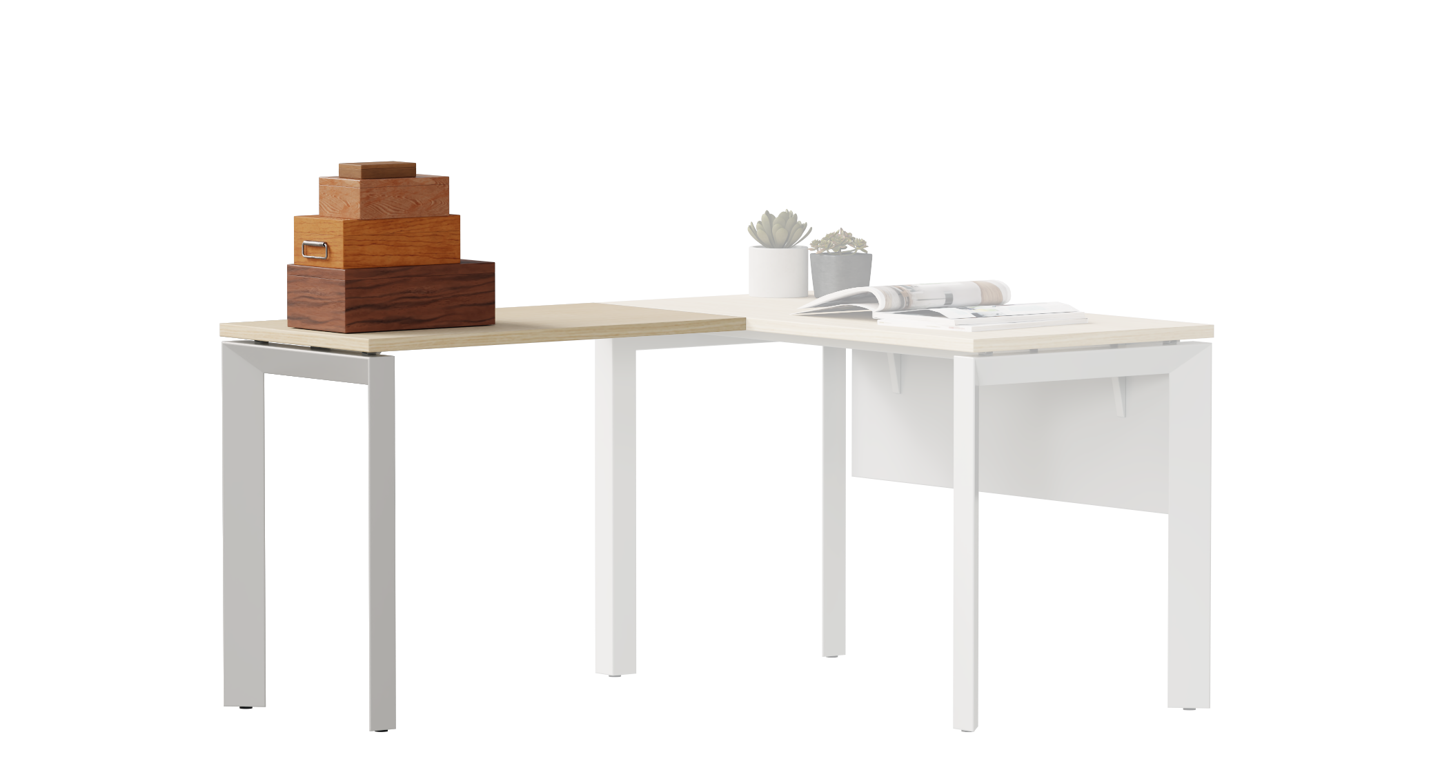Với thiết kế mở rộng bằng bàn nối hông, hệ bàn TALENT dễ dàng biến hóa thành góc L linh hoạt – giải pháp hoàn hảo cho những ai cần không gian làm việc rộng rãi và ngăn nắp hơn. Kiểu dáng chân tam giác vẫn được giữ làm điểm nhấn nhận diện, nhưng khi kết hợp cùng mặt bàn nối, tổng thể trở nên cân đối và hiện đại hơn.